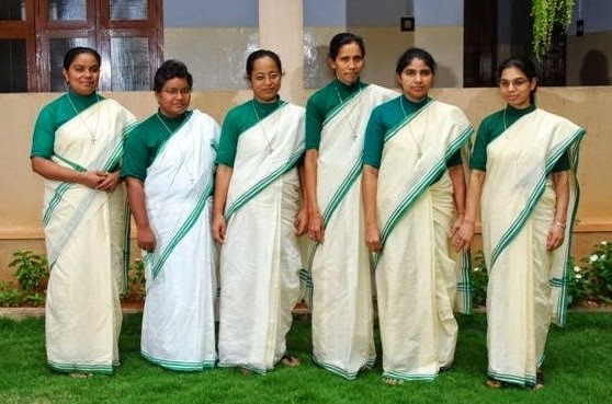 | Siostry nie noszą habitów lecz jednolity świecki strój: biało-zielone sari, na piersi zawieszony krzyżyk. |